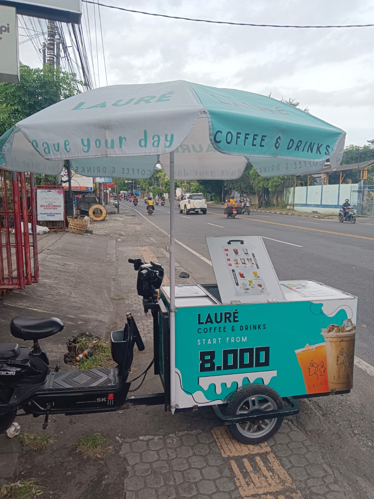 道端コーヒーは2023年ごろから出始めたので、つい最近のものです。道端コーヒーはどんなものかというと、移動式のカフェをコンセプトに、自動車やバイクを使用してコーヒーを販売するシステムです。そしてコーヒーもインスタントコーヒーではなく、ポータブルコーヒーメーカーを使用して高品質のコーヒーを手ごろな価格(10,000ルピア~15,000ルピア)ほどで提供しています。この道端コーヒーは、大学周辺、オフィス街、繁華街(コンビニ前など)でよく見かけられます。バリではチャングーやクタ地域、観光客が多いビーチ周辺でも見かけることが多いです。道端コーヒーは屋台と違い椅子や机などはなく、テイクアウトのみのスタンドが多いです。