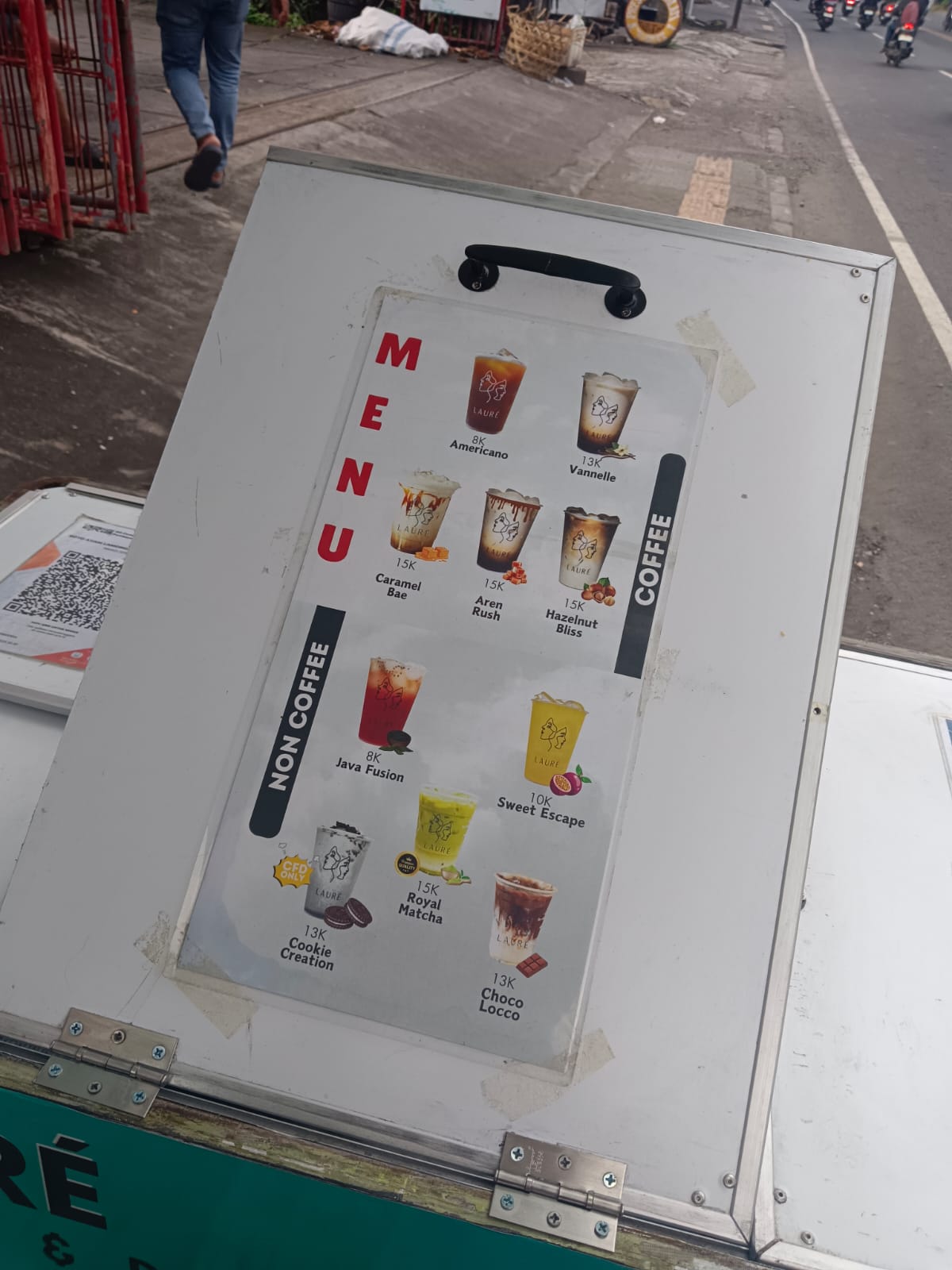 実際道端コーヒーを見つけたので買ってみました!場所はデンパサールにある屋台前。メニューは8,000ルピア~15,000ルピアととてもお手ごろな値段です。メニューを見てみるとコーヒー以外にもアイスティーや抹茶ラテもありました。