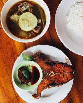 ワルン・マク・ベンの特徴は、メニュー表がないことです。なぜなら、ここで出されるのはたった一つのセットメニューだけだからです。メニューの内容は揚げ魚、魚のスープ、白米、そしてバリ風特製サンバルです。揚げ魚は外側はカリッとしかっりあげられ、中はホクホク、セットのサンバルと食べる病みつき間違いなし。スープは少し辛いですがこれまた揚げ魚と一緒に食べるのにぴったりでごはんが進みます。そしてこのスープにはきゅうりが入っているというユニークなスープで、オーナーが自ら生み出したレシピだそうです。ただし、食べるときは揚げたてなので熱さに気を付けてください!