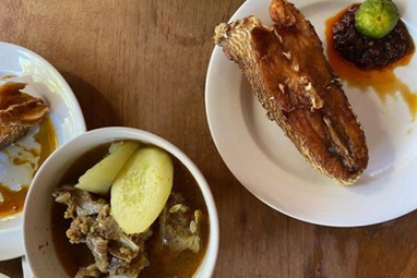 Googleマップを頼りに、私は海岸から屋台へ向かう細い道を歩いていきました。10分もかからず、緑の看板に「ワルン・マク・ベン」と書かれた文字がはっきりと視界に入りました。建物は簡素で目立たず、注意していなければ見過ごしてしまうかもしれないほどです。中に入ると、すぐにその場の雰囲気に驚かされました。まだ朝早い時間にもかかわらず、木製のテーブルはほぼ満席だったのです。外国人観光客もいれば、地元の家族連れや若者グループまでいました。この屋台の店内は、数十年前からほとんど変わっていません。シンプルなプラスチックの椅子、無地のペンキで塗られた壁、そして客が従業員の忙しそうな様子を覗き見できるオープンキッチン。一部の人にとっては、あまりにも平凡に映るかもしれません。でもこのなつかしさが漂う雰囲気が他の食堂とは違い、私のお気に入りの点の一つなのです。